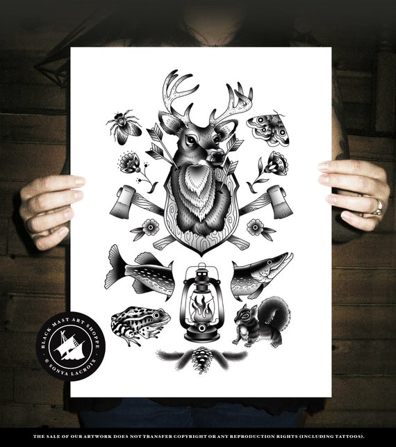 Outdoors Flash Set Deer Animals Traditional Tattoo Flash Etsy Uk